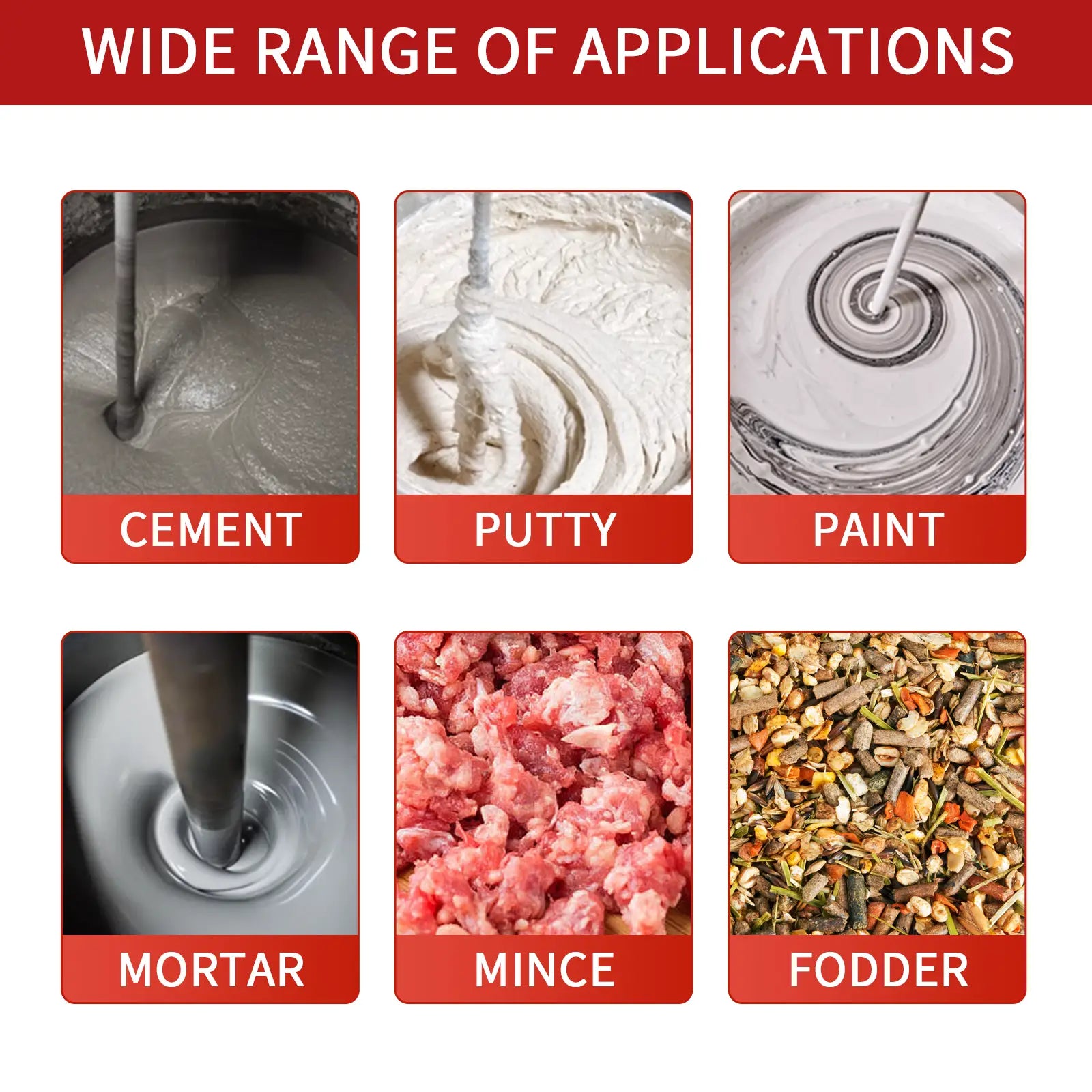 【Powerful Motor】This Cement mixer equiped 1200 Watt motor with 270-950 RPM, Suitable for mixing oil paint, cement, fodder, mud, printing ink, thin-set mortar, plaster, cementitious adhesives